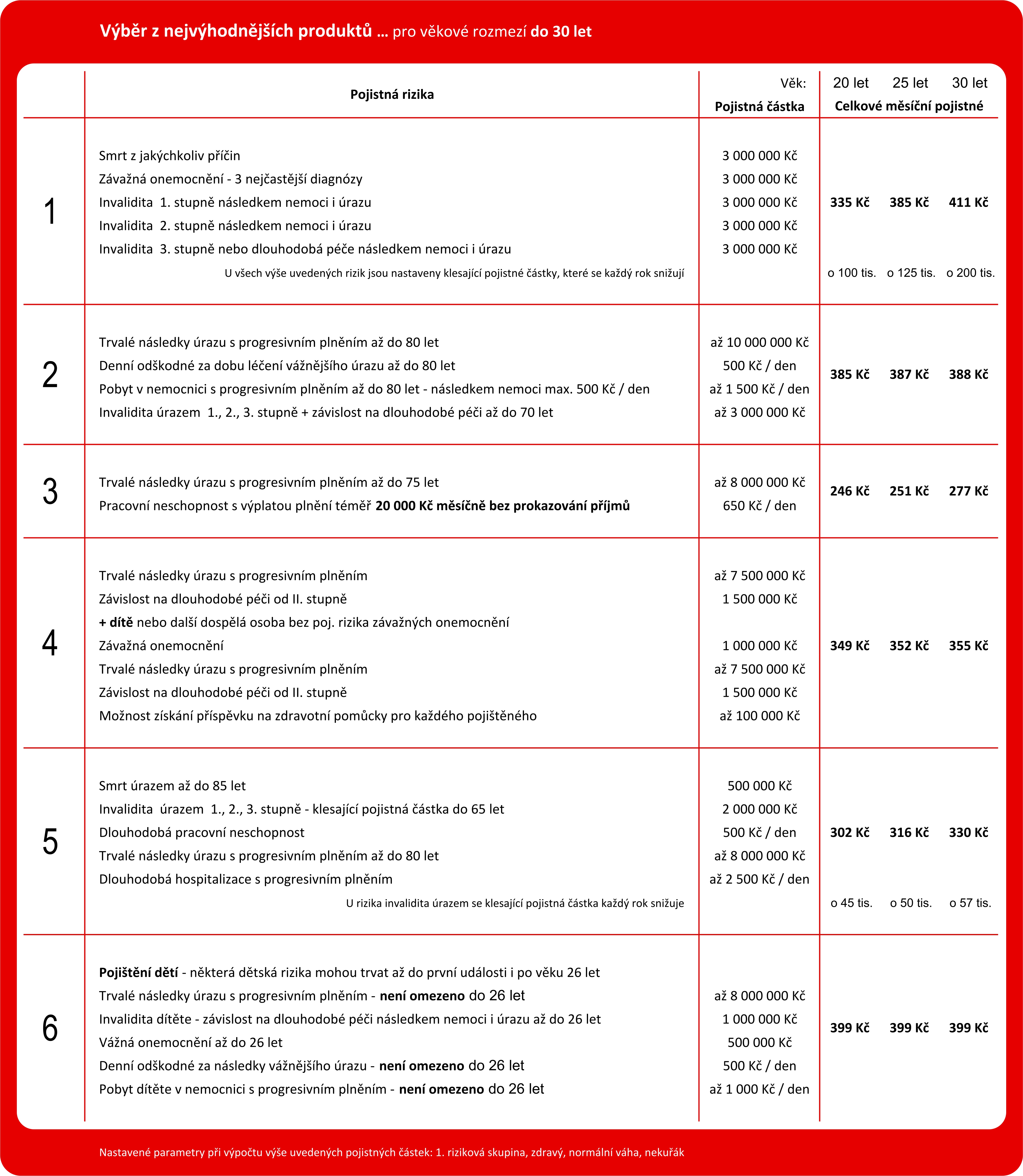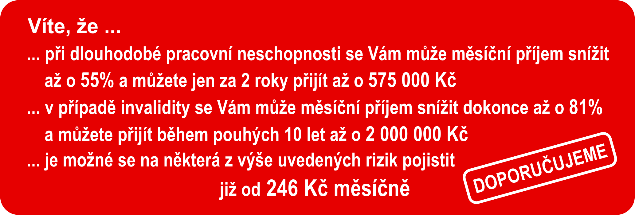 Už za pár set korun měsíčně můžete být pojištěni na některá rizika, která Vás mohou finančně nejvíc ohrozit a která by neměla ve Vašem pojištění rozhodně chybět. Samozřejmě záleží na věku, povolání a dalších kritériích, které ovlivňují rizikovost a tím pádem i cenu pojištění. Čím dříve se na některá rizika pojistíte (platí hlavně u invalidity a závažných onemocnění), tím méně budete platit.