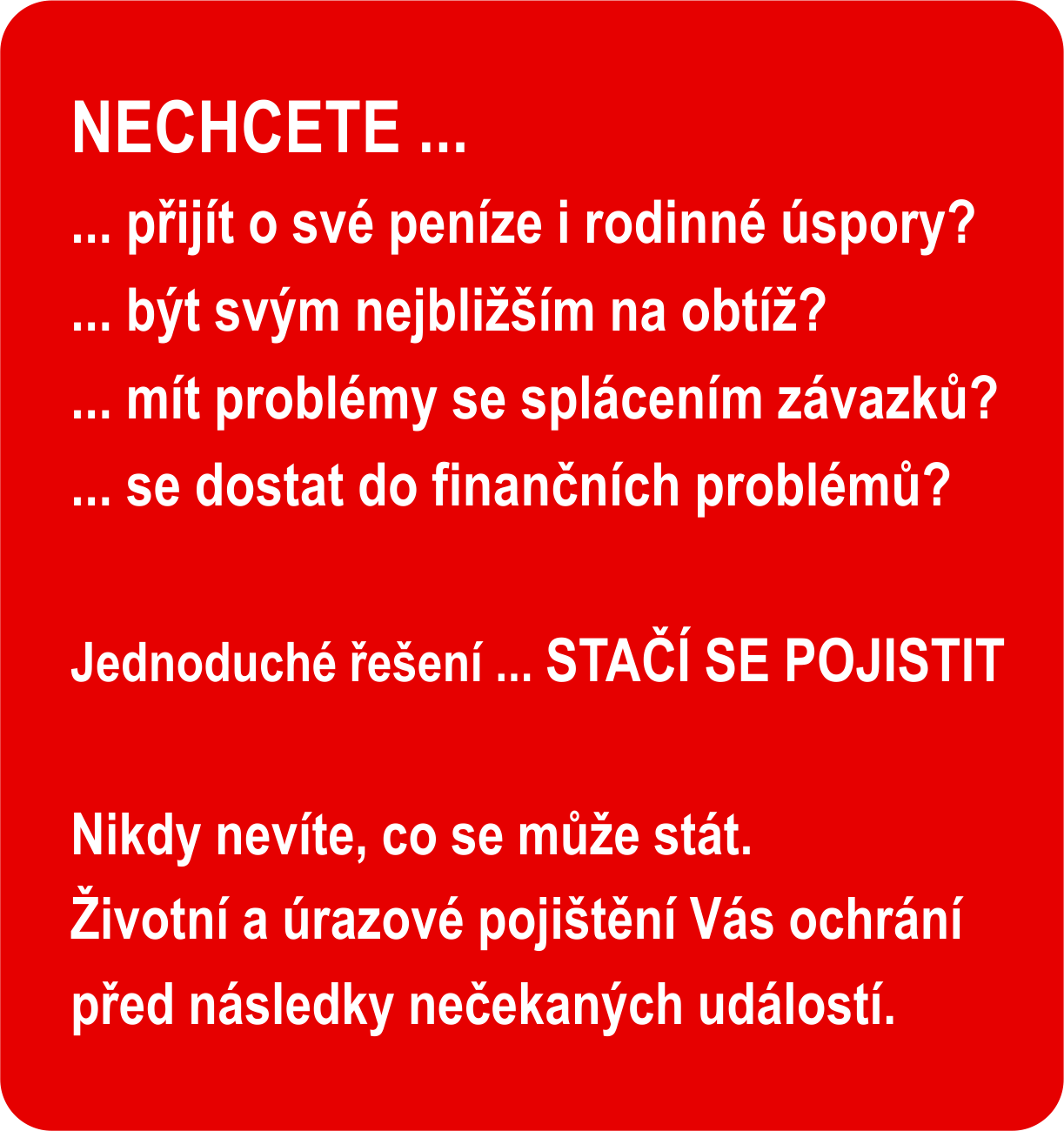 … pokud jsou pojištěni, tak na méně důležitá rizika a naopak ty nejdůležitější, jako např. pojištění invalidity, závislosti na péči, dlouhodobé pracovní neschopnosti apod. buď nemají vůbec nebo u nich mají nastavené tak malé pojistné částky, které by jim na placení dlouhodobých výdajů a veškerých nákladů s léčbou rozhodně nestačily